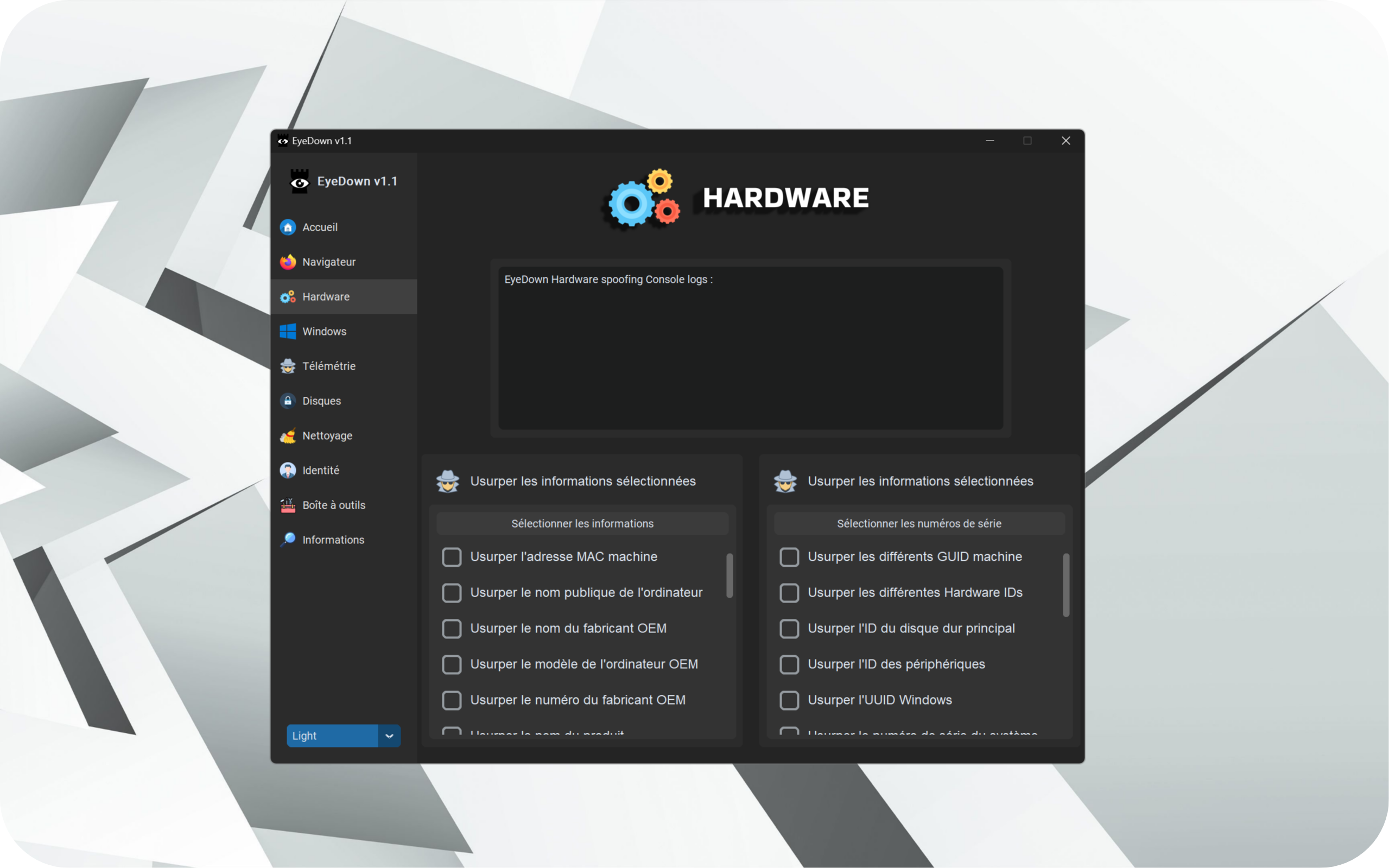Eyedown Software est spécialement conçu pour les personnes qui souhaitent protéger leur identité numérique en ligne. En anonymisant totalement votre connexion et votre machine, Eyedown Software vous rend intraçable. Eyedown configure tous les processus nécessaires à l'anonymisation totale de l'ordinateur, tels que :
