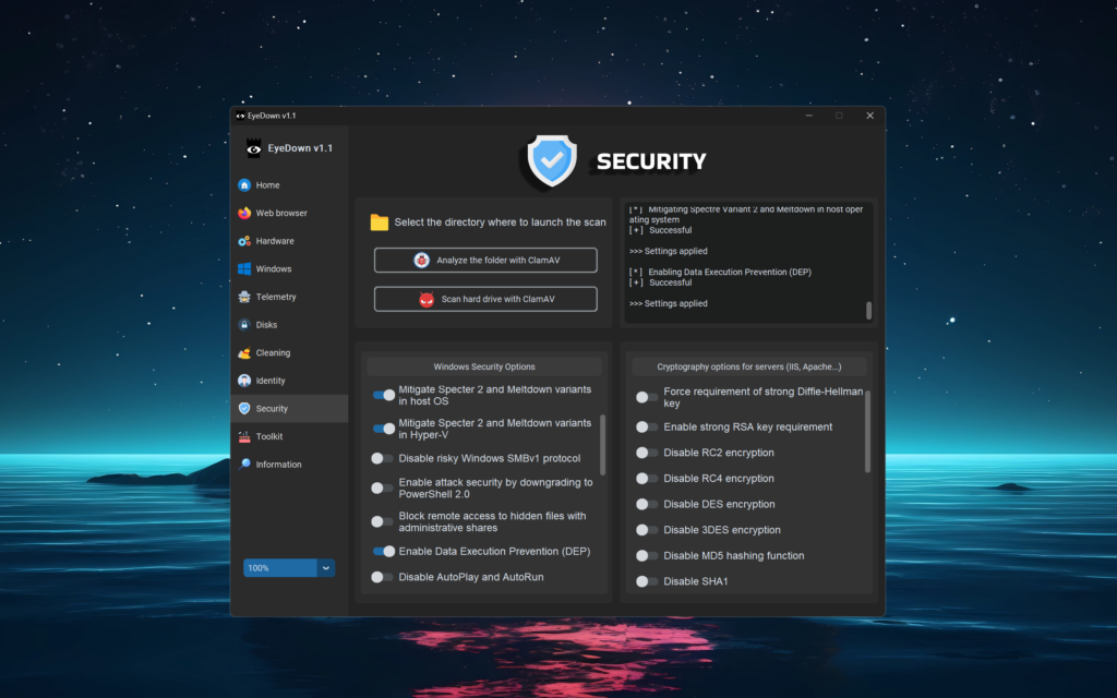 EyeDown makes it easy to configure these vulnerability mitigation options. Simply toggle the desired option in the EyeDown interface to activate it, providing an additional layer of security to your system. To revert any changes, simply toggle the option off.